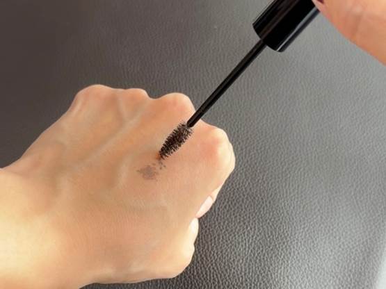 特にマスカラブラシの先端に液体が溜まりやすいので、先端を手の甲で数回トントンすると余分な液体が落ち、ベタづきを防ぐことができます。