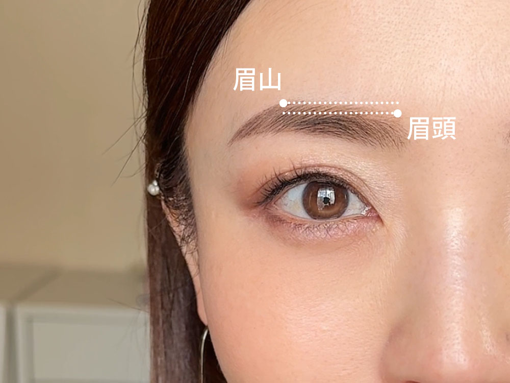 眉山が一番高くなるように描くには、眉頭より眉山を高い位置に設定する必要があります。目安は眉頭より2~3ミリ高くなるような位置。