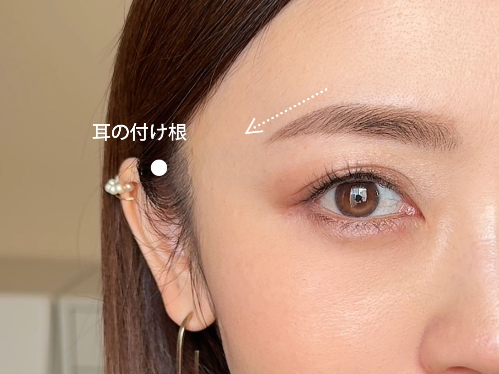 眉山から眉尻は斜めに下げるのがポイント。耳の上側の付け根に向かってゆるい曲線で下げると自然な角度に仕上がります。