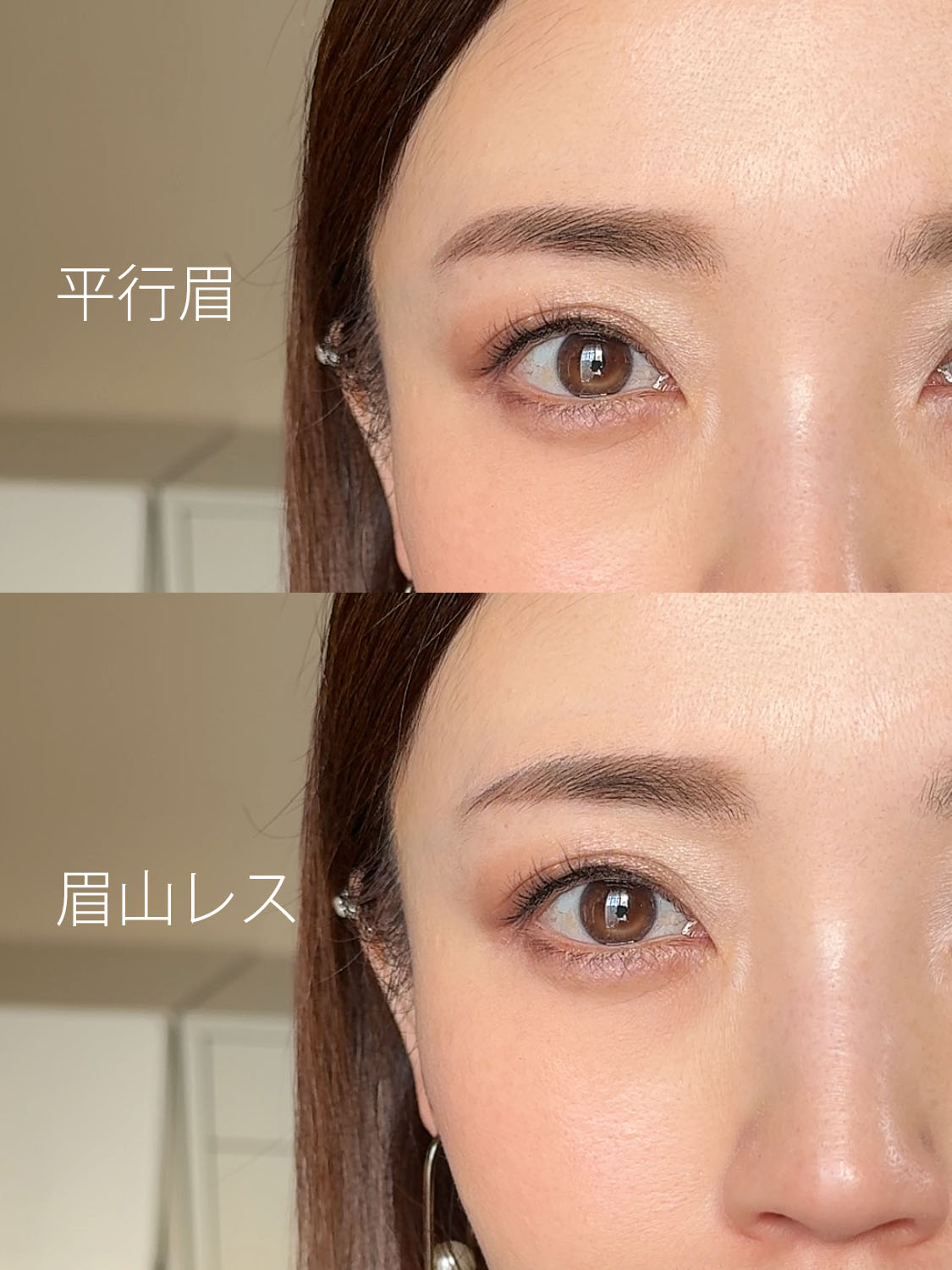 平行眉から派生するように、若い世代の間で取り入れる人が多かったのが眉山のない眉=眉山レス。平行眉が眉頭~眉尻までほぼ同じ高さで描くのに対し、眉山レスは眉頭が一番高く、眉尻に向かって下がるように描くのが特徴。