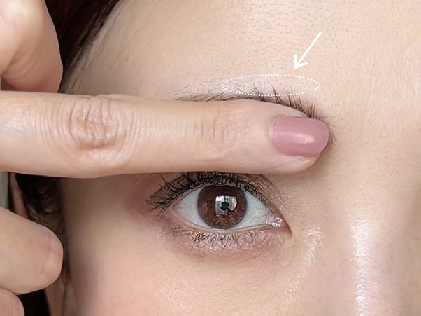 スクリューブラシを横に持ち、眉頭の毛を真上にグッと持ち上げます。このとき上の輪郭より2ミリ以上出た毛先部分のみ軽くカット。