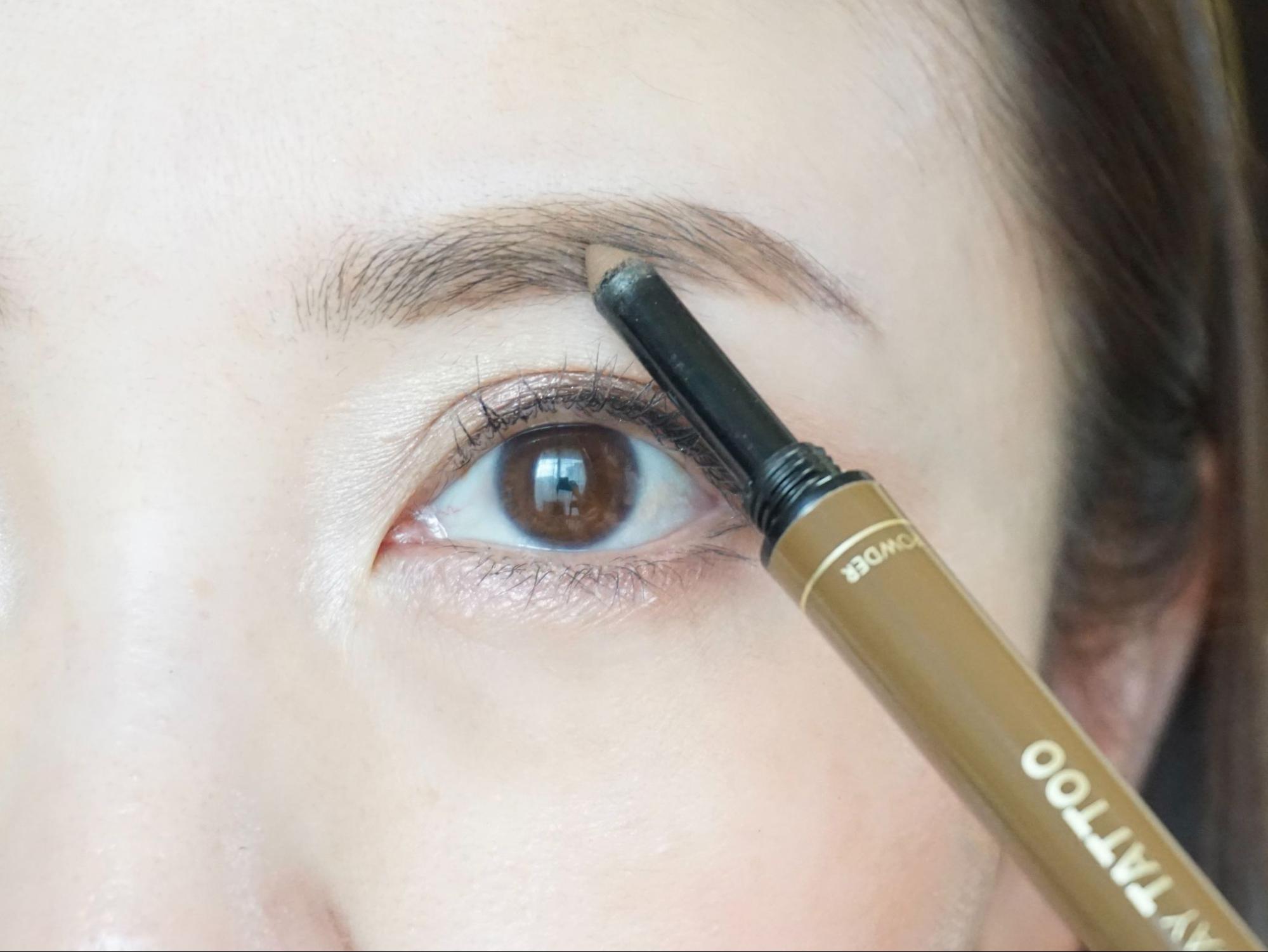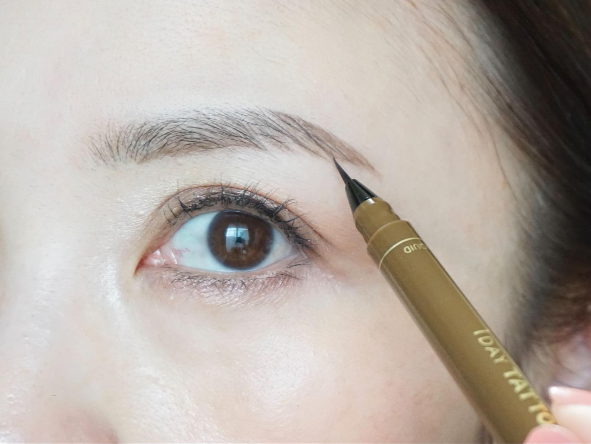 まずはアイブロウリキッドで毛が足りない部分を描き足します。このとき、周囲の毛並みと同じ方向に向かってサッサっと軽いタッチで描き足すのがポイント。