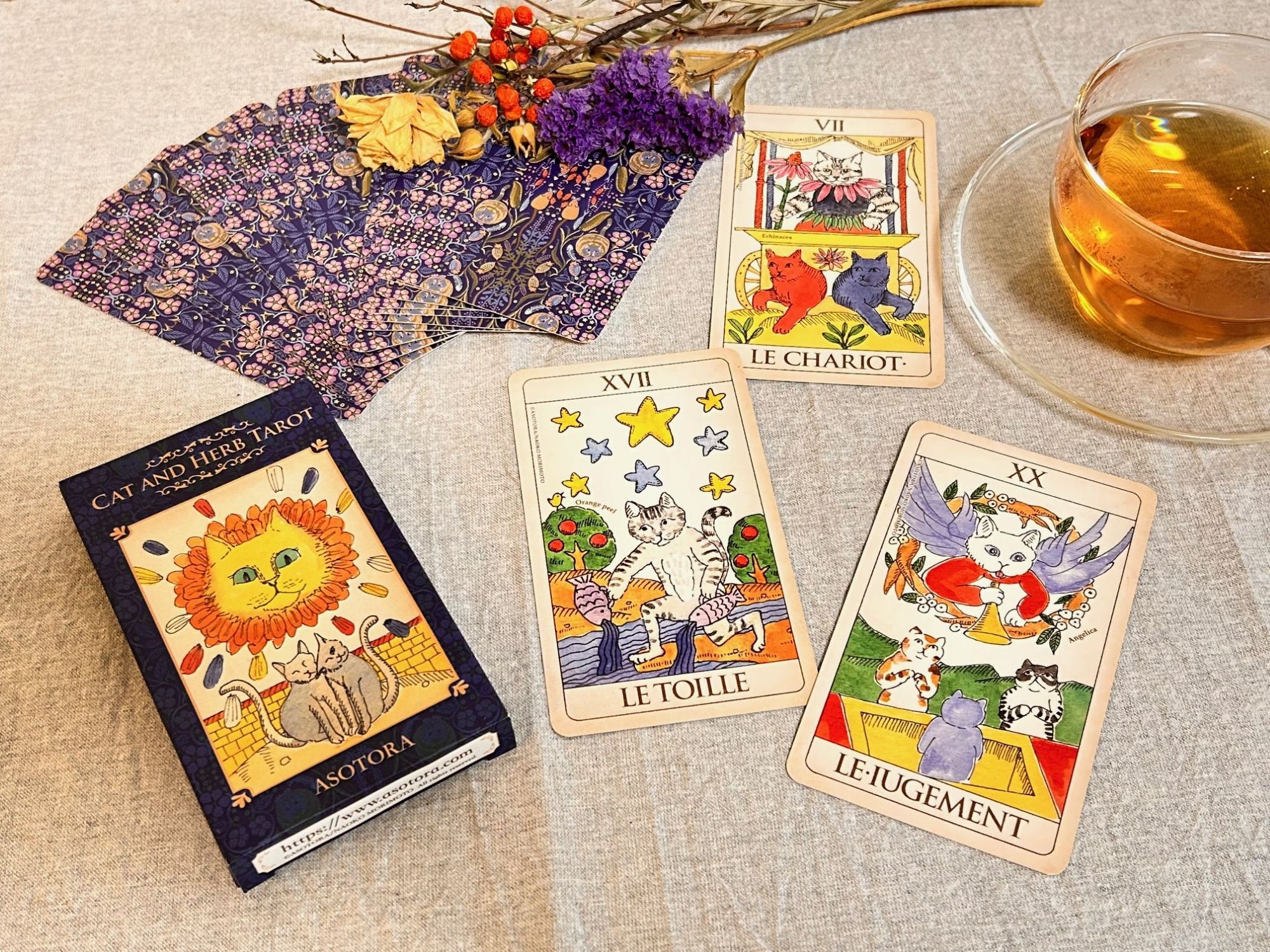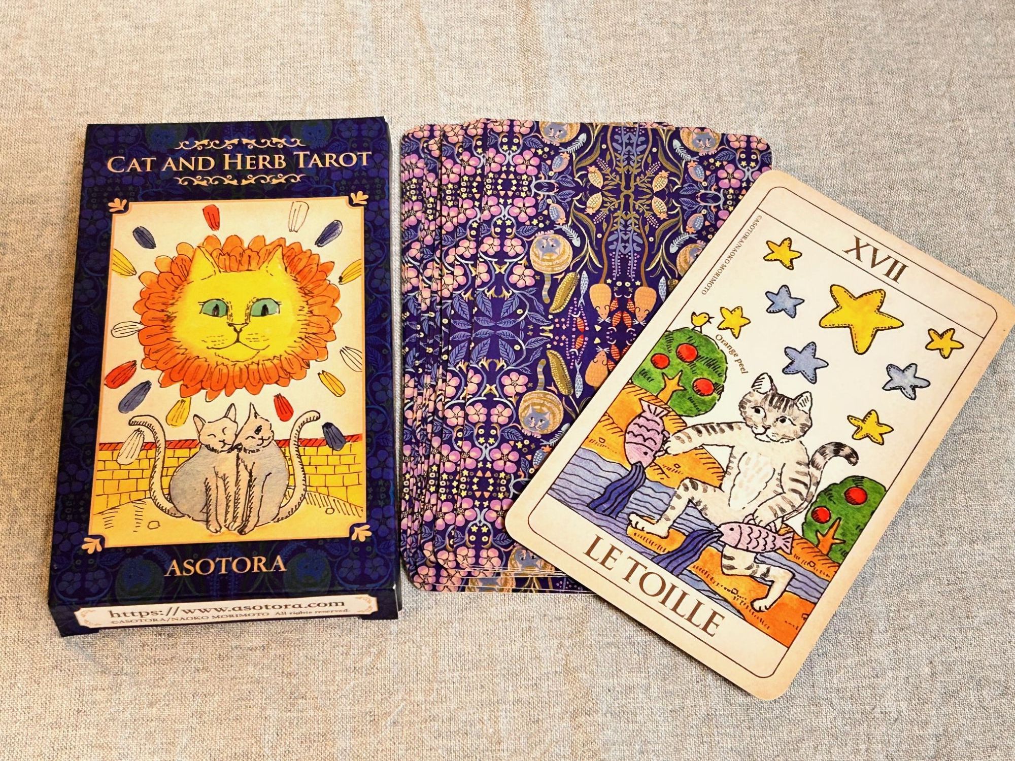 今回のセルフリーディングで使用するのは、私が日頃愛用している**「CAT AND HERB TAROT」**。画家であり、トランプやタロットの作家としても活動している、**森本ナオコさん(あそびトランプ堂)**のカードです。