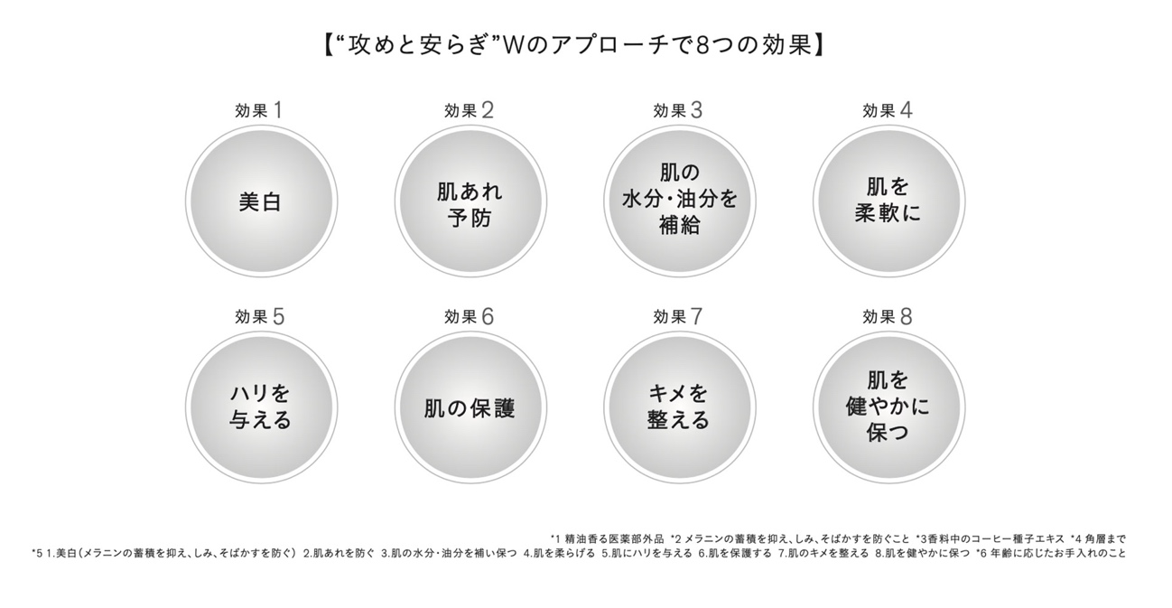 表皮のターンオーバーを軸に、美白・肌あれ予防を含む8つの効果。(下記画像参照)。美しさのサイクルが整うことで、ゆらぎがちな肌にも届けるエイジングケアで、“攻めと安らぎ”のWのアプローチをしてくれます。