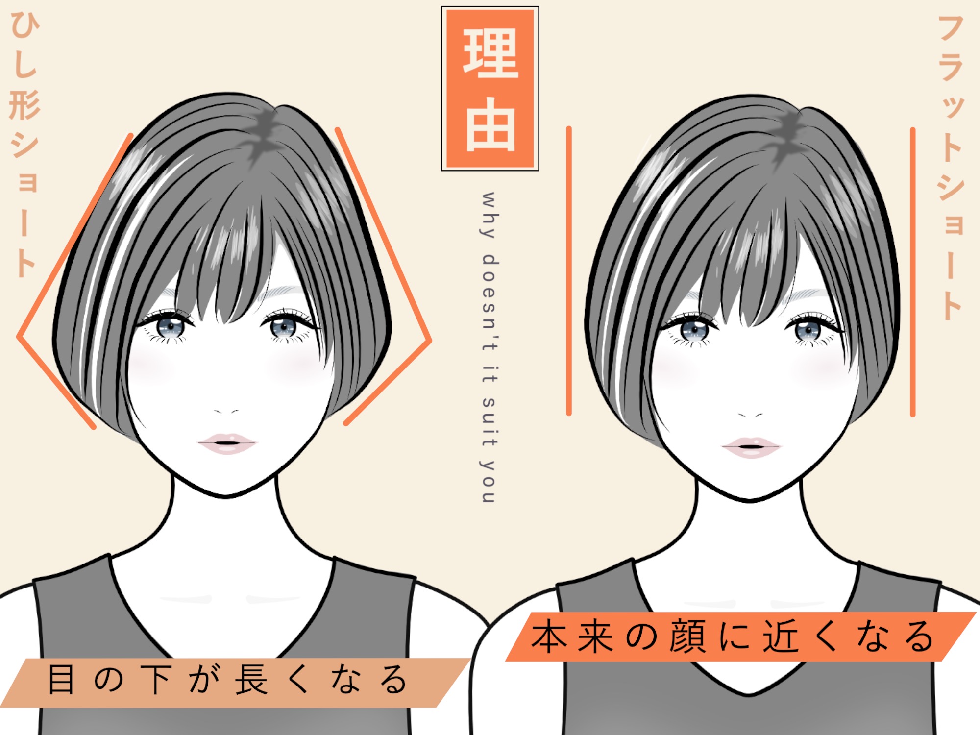 対策としては、弱いひし形にするか、イラストのようなフラットなショートにカットする。
