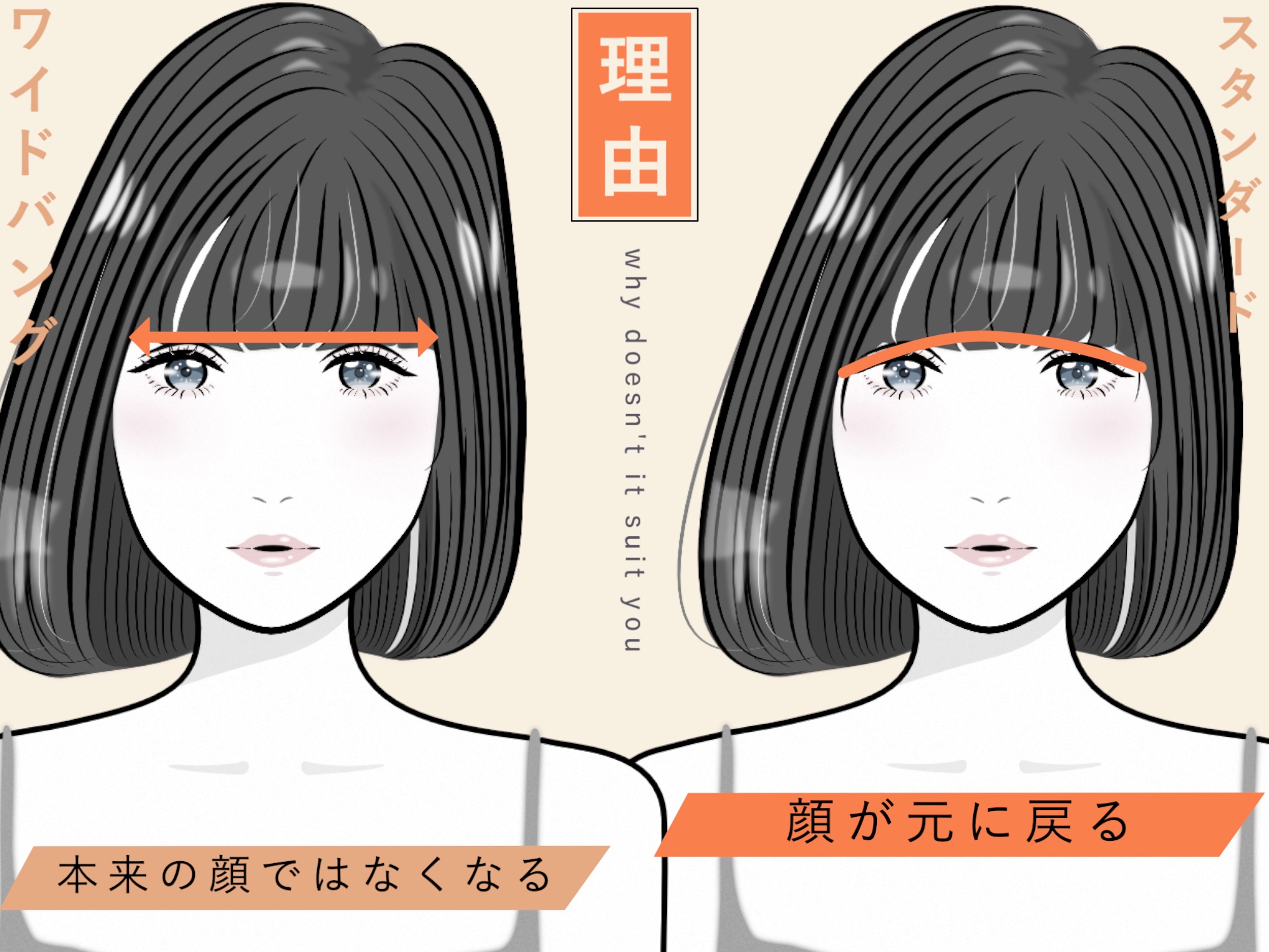 みみキャット:ワイドバングは髪型の影響を受けて顔がスクエアに見えます。普通の前髪や流す前髪はラウンドしているので、 本来顔の基準の形はラウンドしています。だから普通の前髪や流す前髪は、自然な顔の形に見えるんです。